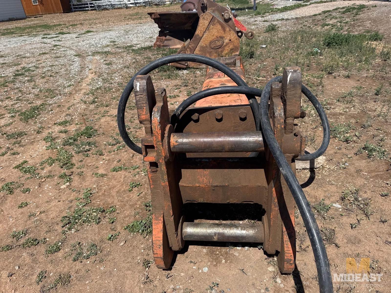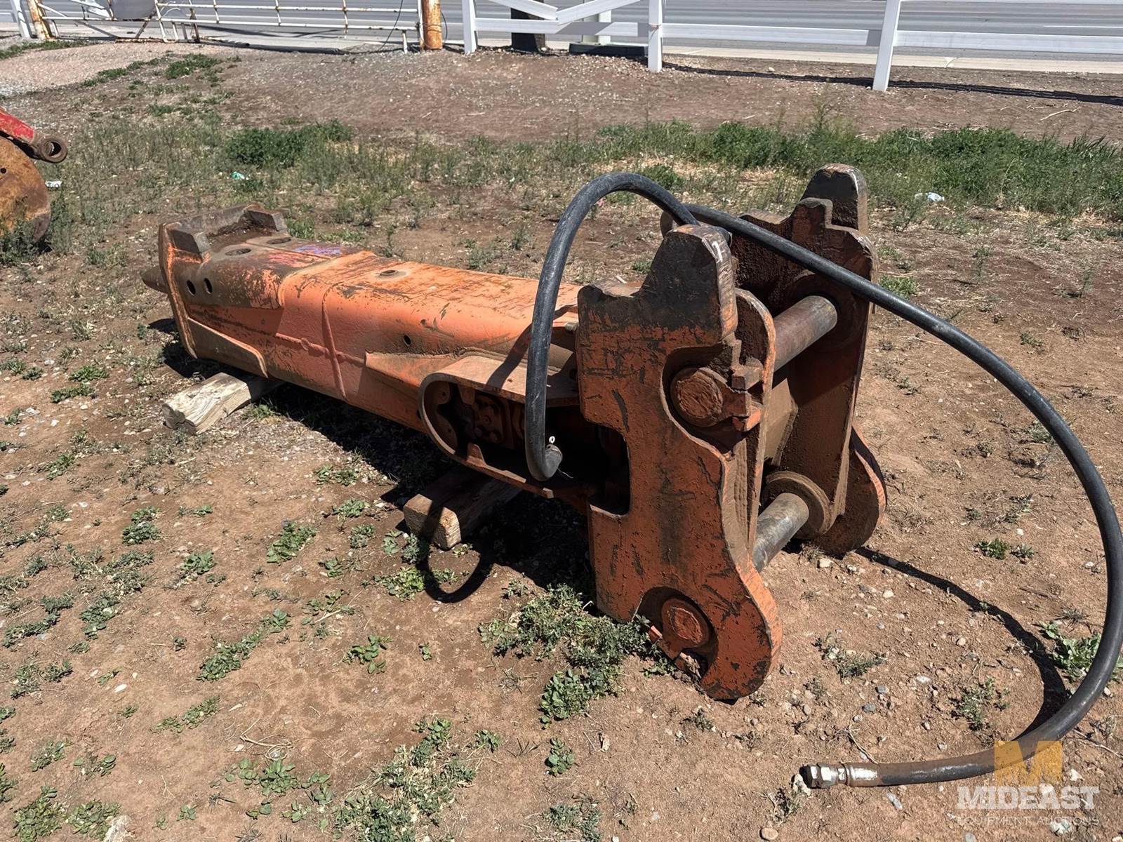 Hydraulic rock hammer attachment with chisel bit. Heavy duty unit includes hydraulic hoses and mounting bracket.