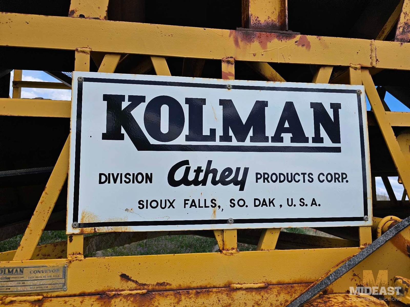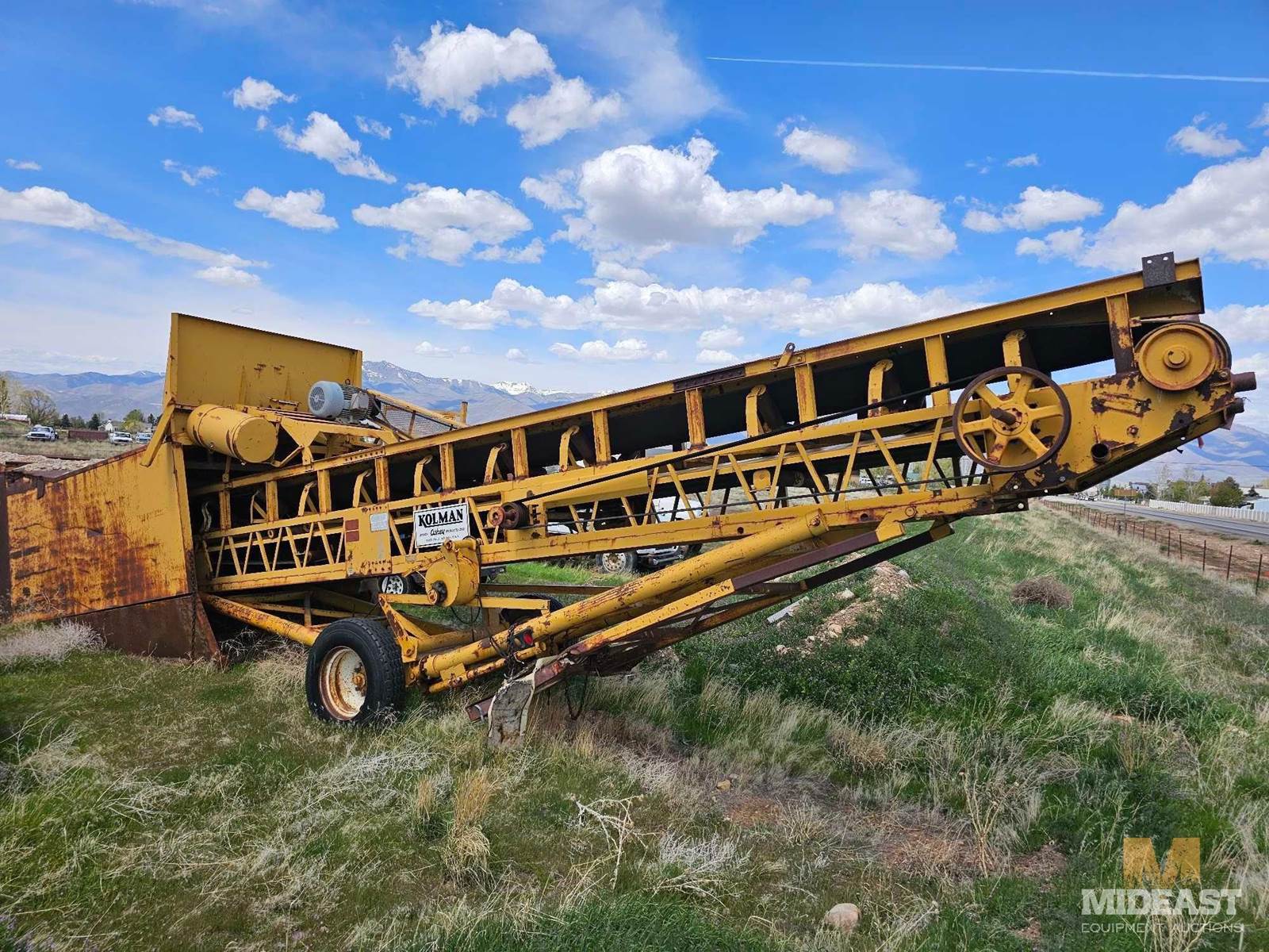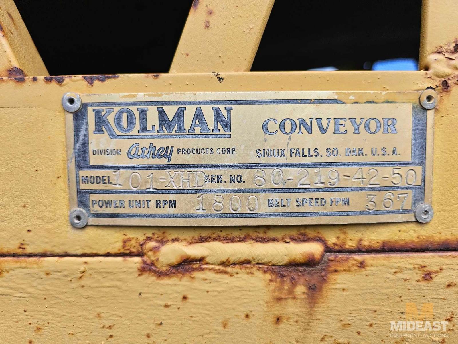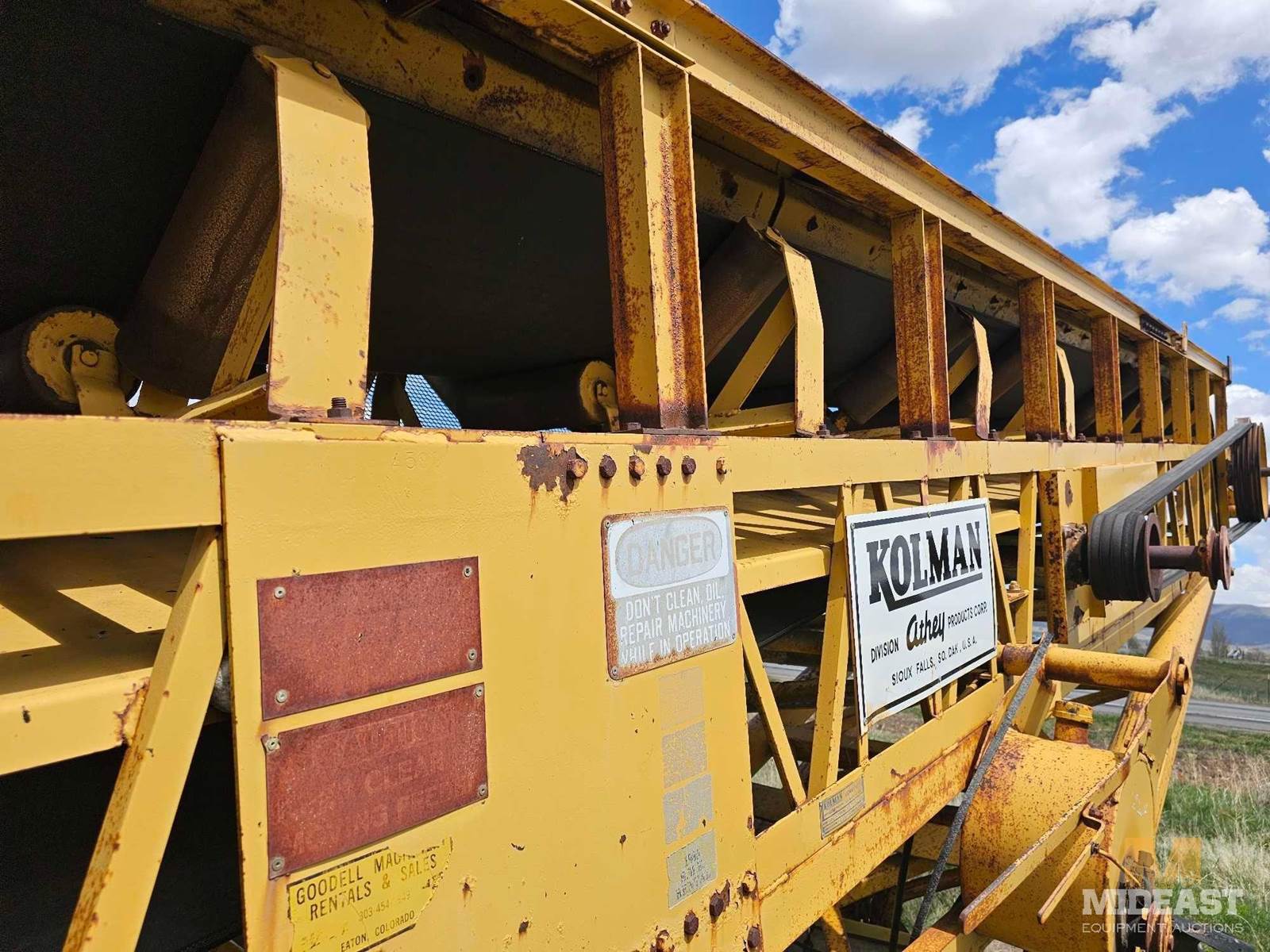 Kolman portable belt conveyor with integrated trap loader. Heavy-duty unit designed for material handling an loading applications. Conveyor is mounted on a towable frame for job site mobility. Includes feed hopper/trap loader for efficient loading of aggregate, dirt, or similar materials.
