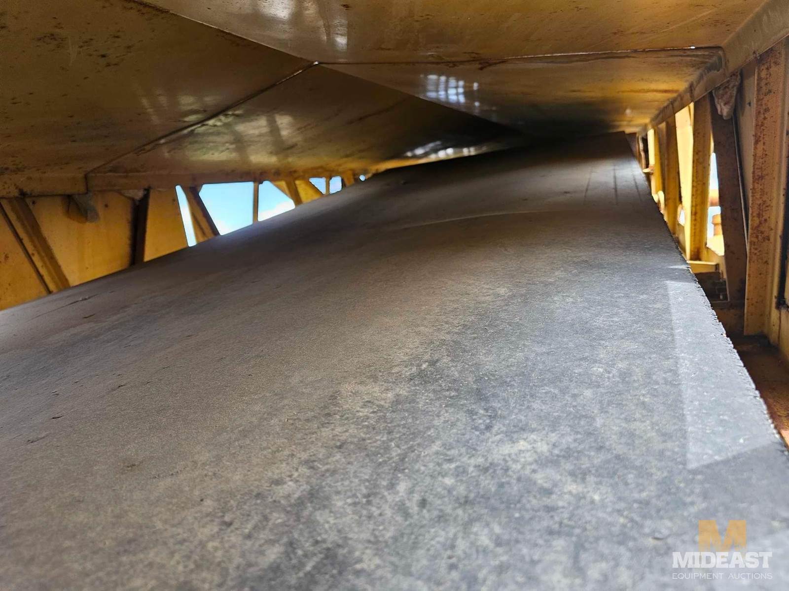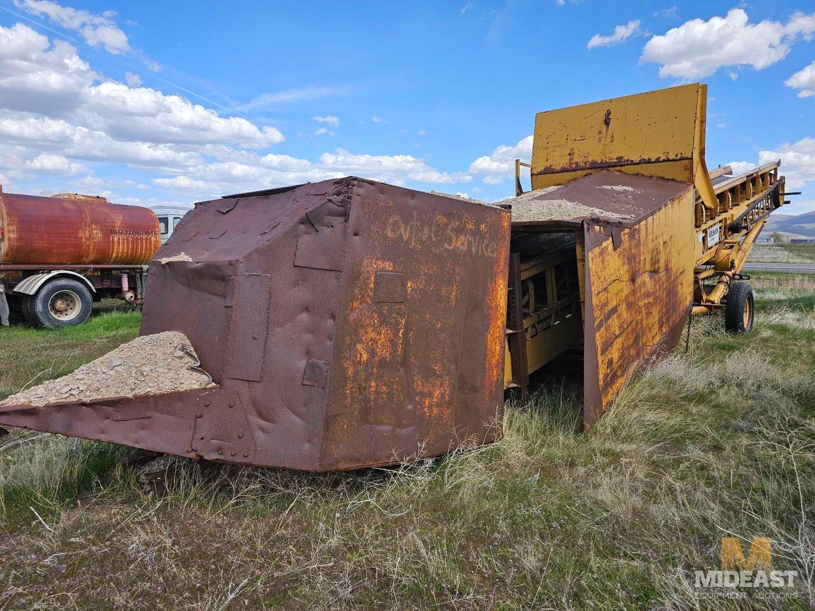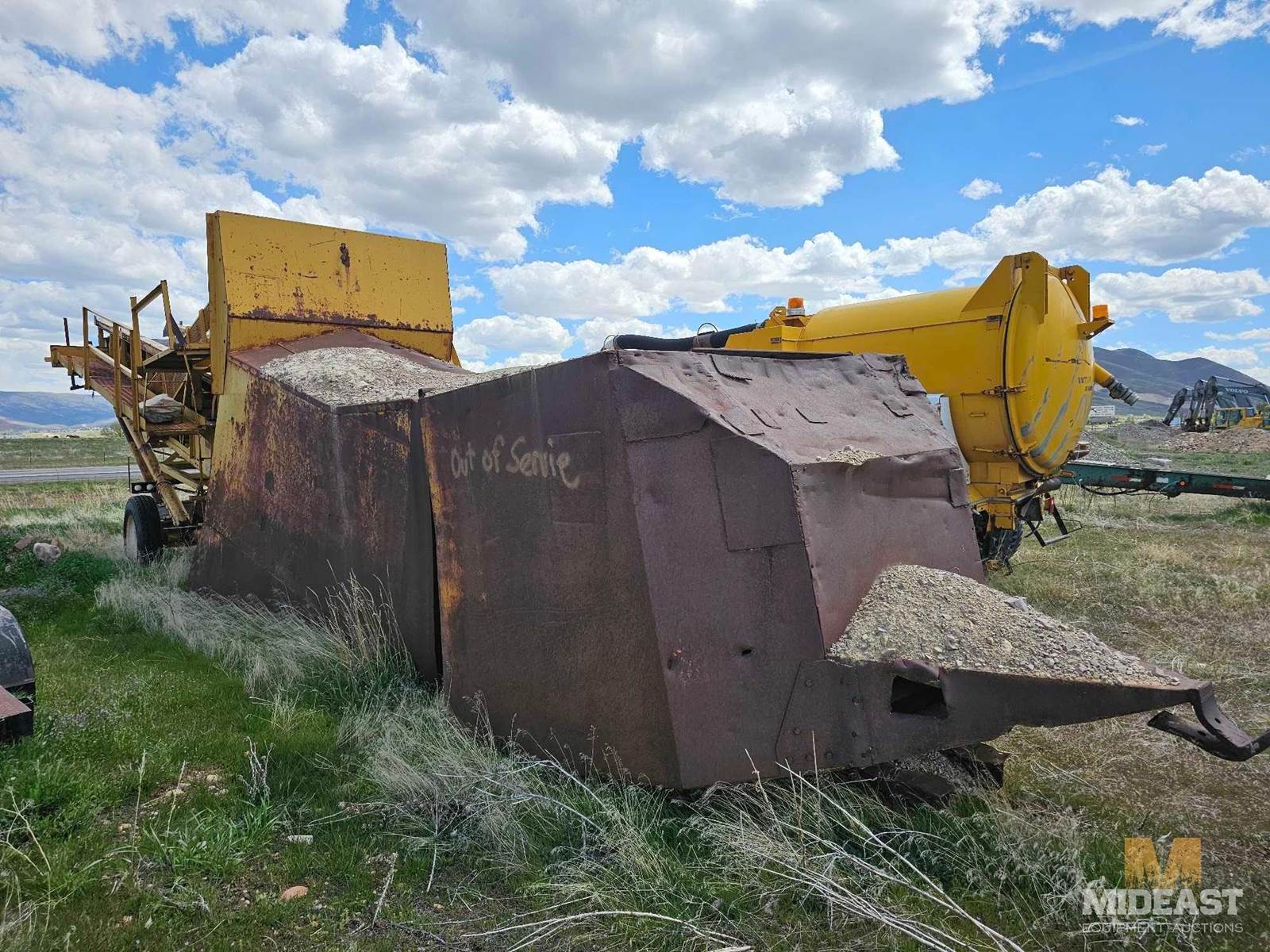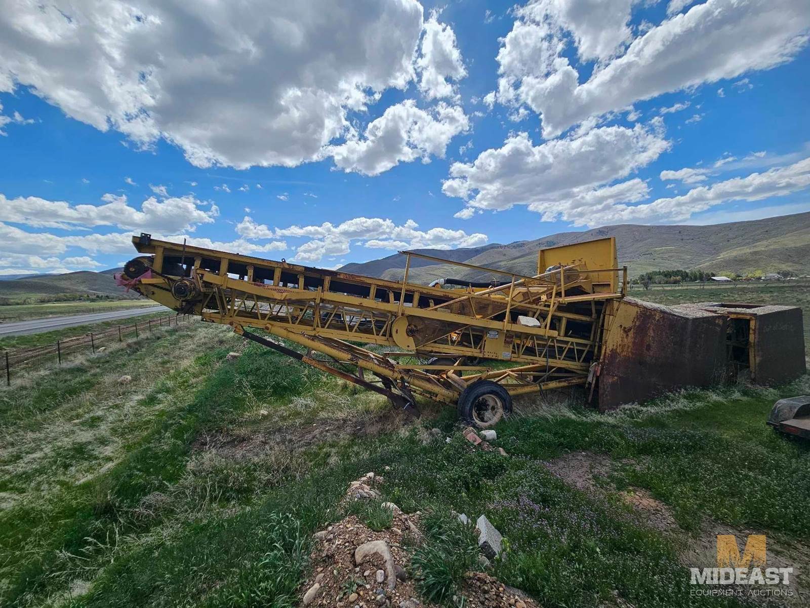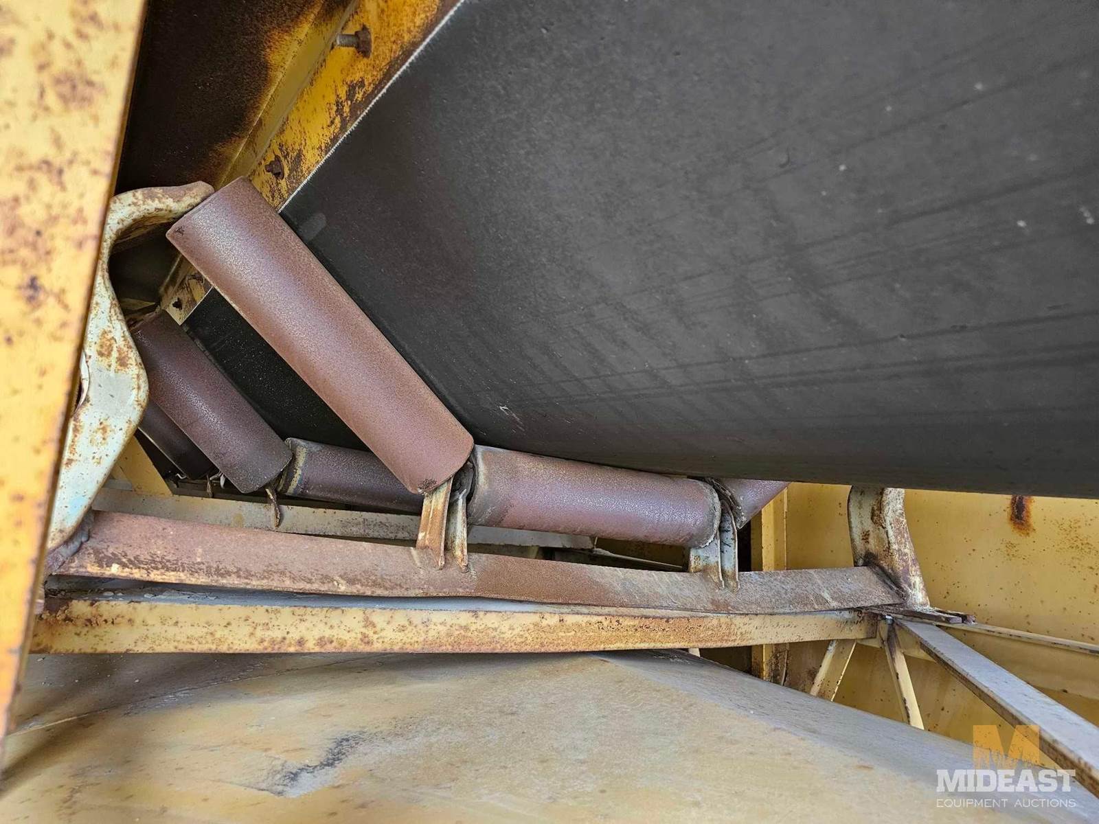 Kolman portable belt conveyor with integrated trap loader. Heavy-duty unit designed for material handling an loading applications. Conveyor is mounted on a towable frame for job site mobility. Includes feed hopper/trap loader for efficient loading of aggregate, dirt, or similar materials.