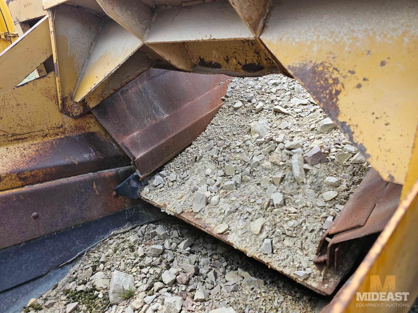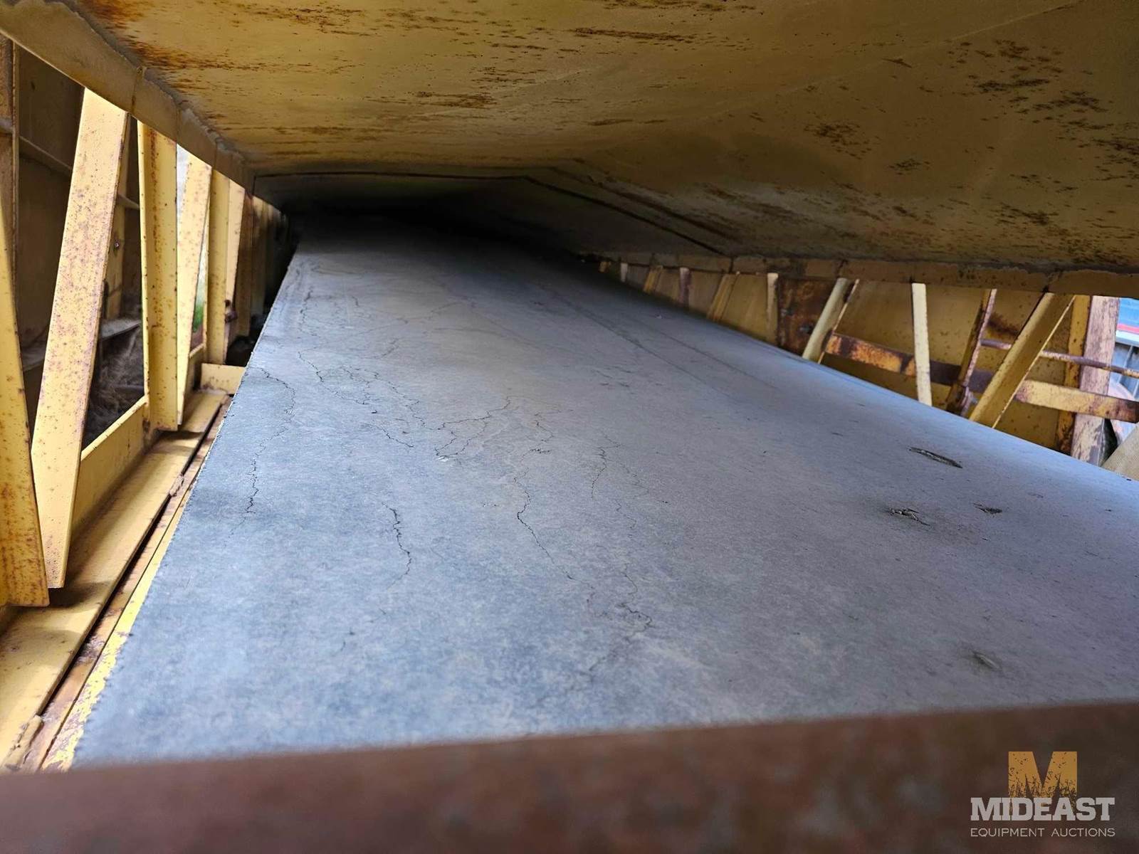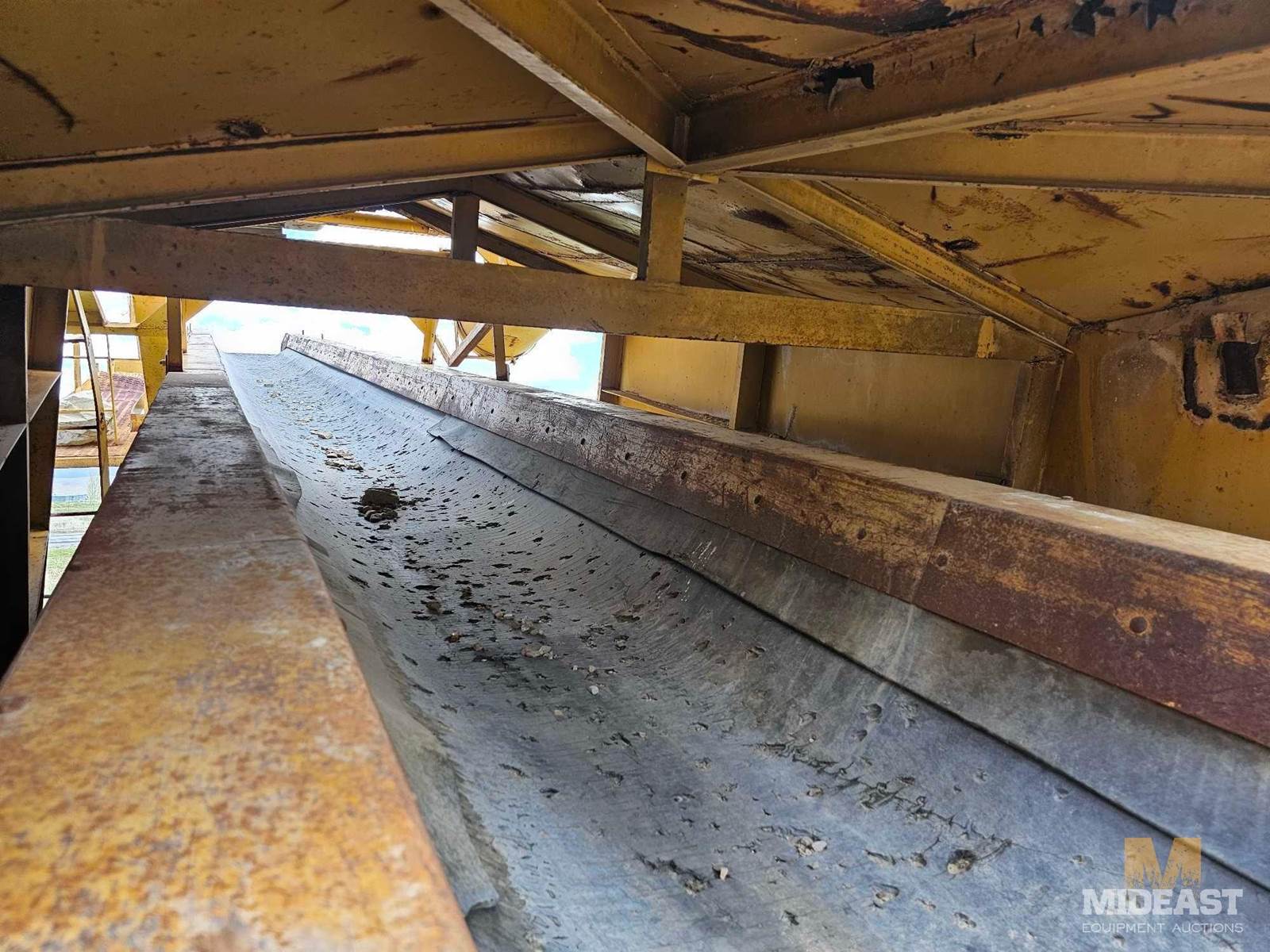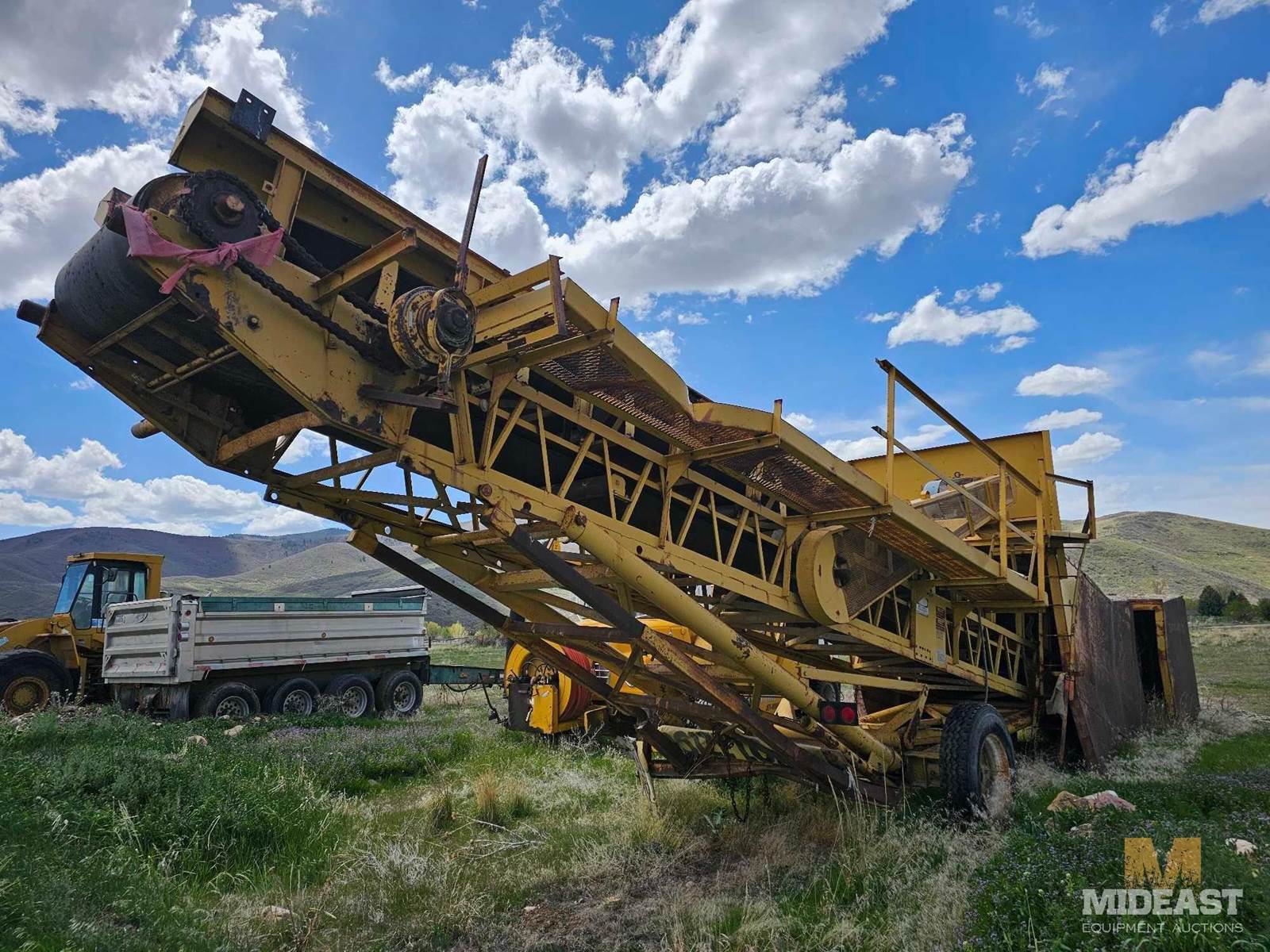 Kolman portable belt conveyor with integrated trap loader. Heavy-duty unit designed for material handling an loading applications. Conveyor is mounted on a towable frame for job site mobility. Includes feed hopper/trap loader for efficient loading of aggregate, dirt, or similar materials.