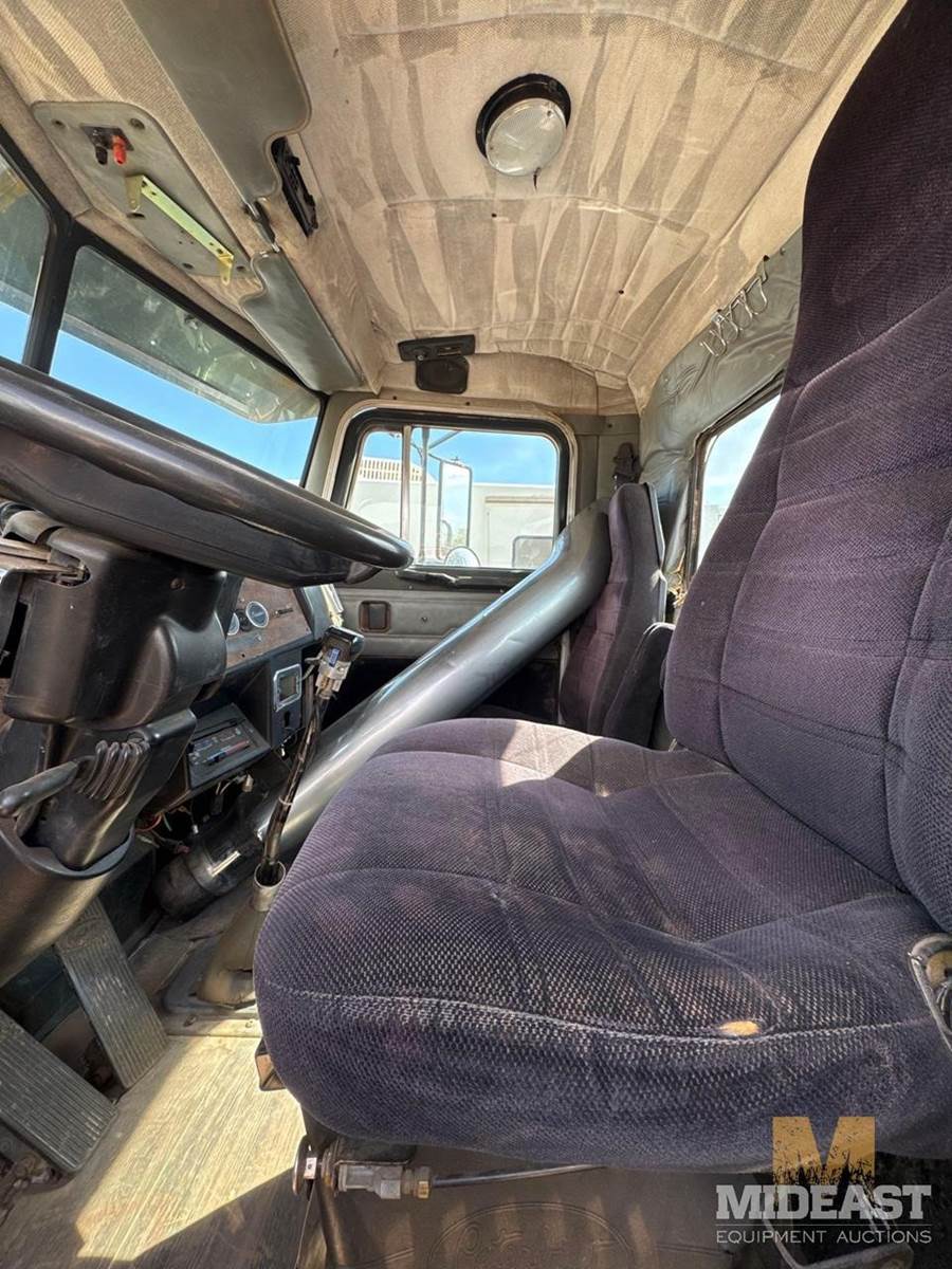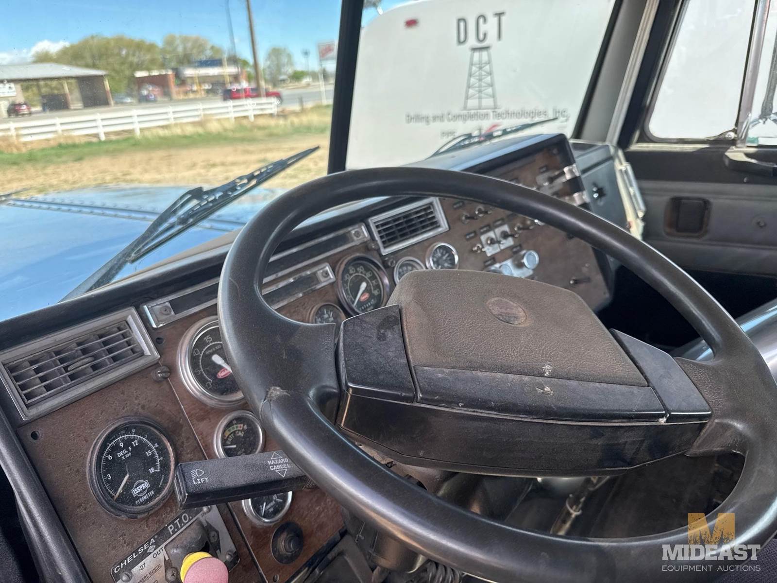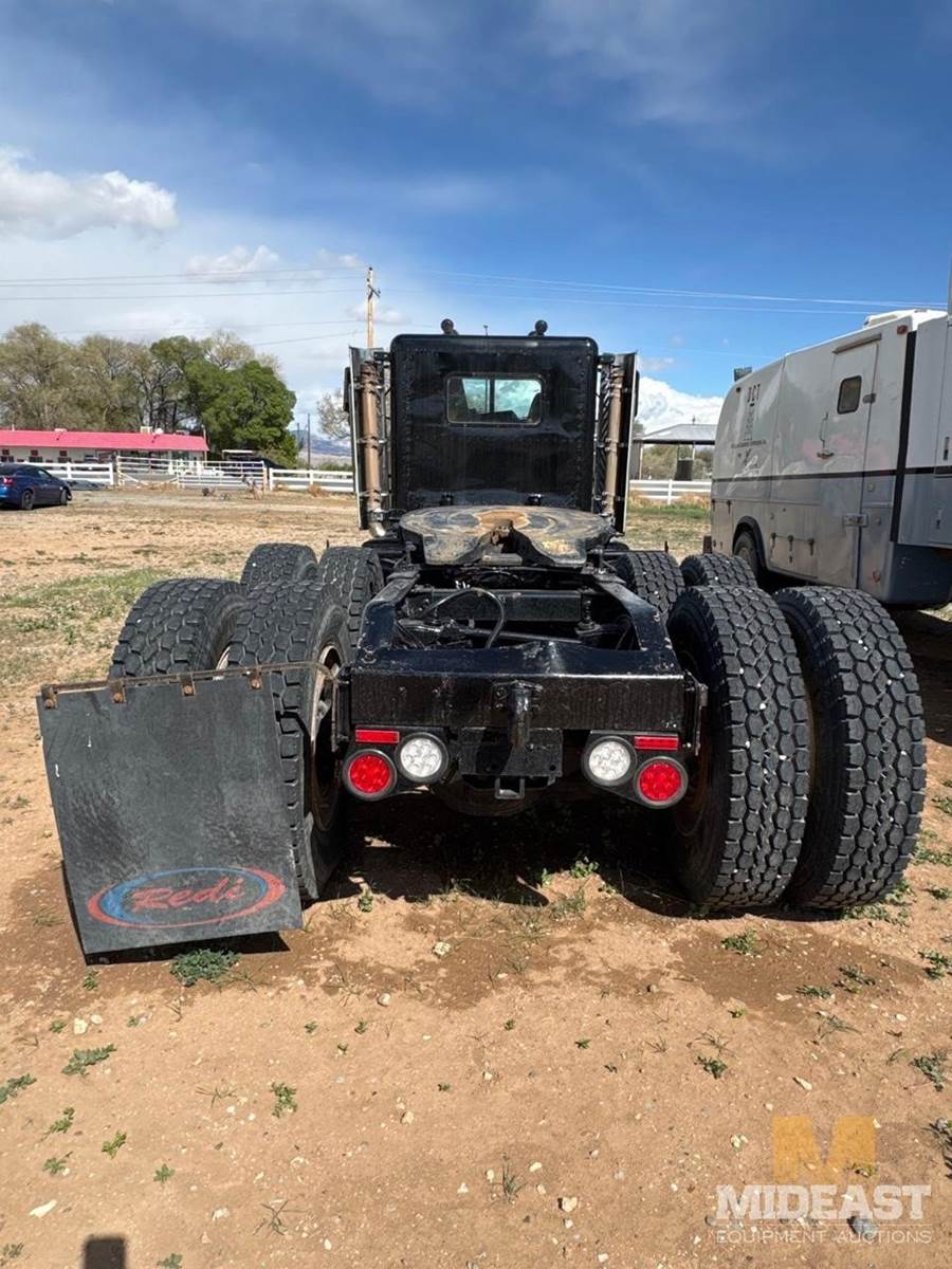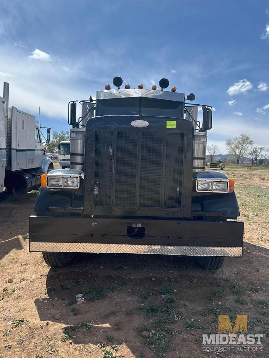 Peterbilt tandem axle day cab semi truck. Heavy-duty setup with dual rear axles and wet kit/PTO controls (Chelsea PTO shown), making it suitable for dump, lowboy, or oilfield applications. Classic long-hood Pete styling with dual vertical exhaust and external air cleaners.Truck shows solid bones with good tread on tires and intact fifth wheel setup. Interior is complete with gauges and controls present. Cosmetic wear consistent with use (chips, dust, surface rust in spots).Highlights:Peterbilt conventional day cabTandem axle (dual rears)Wet kit / PTO equippedDual exhaust stacksExternal air cleanersFifth wheel plateGood tire tread