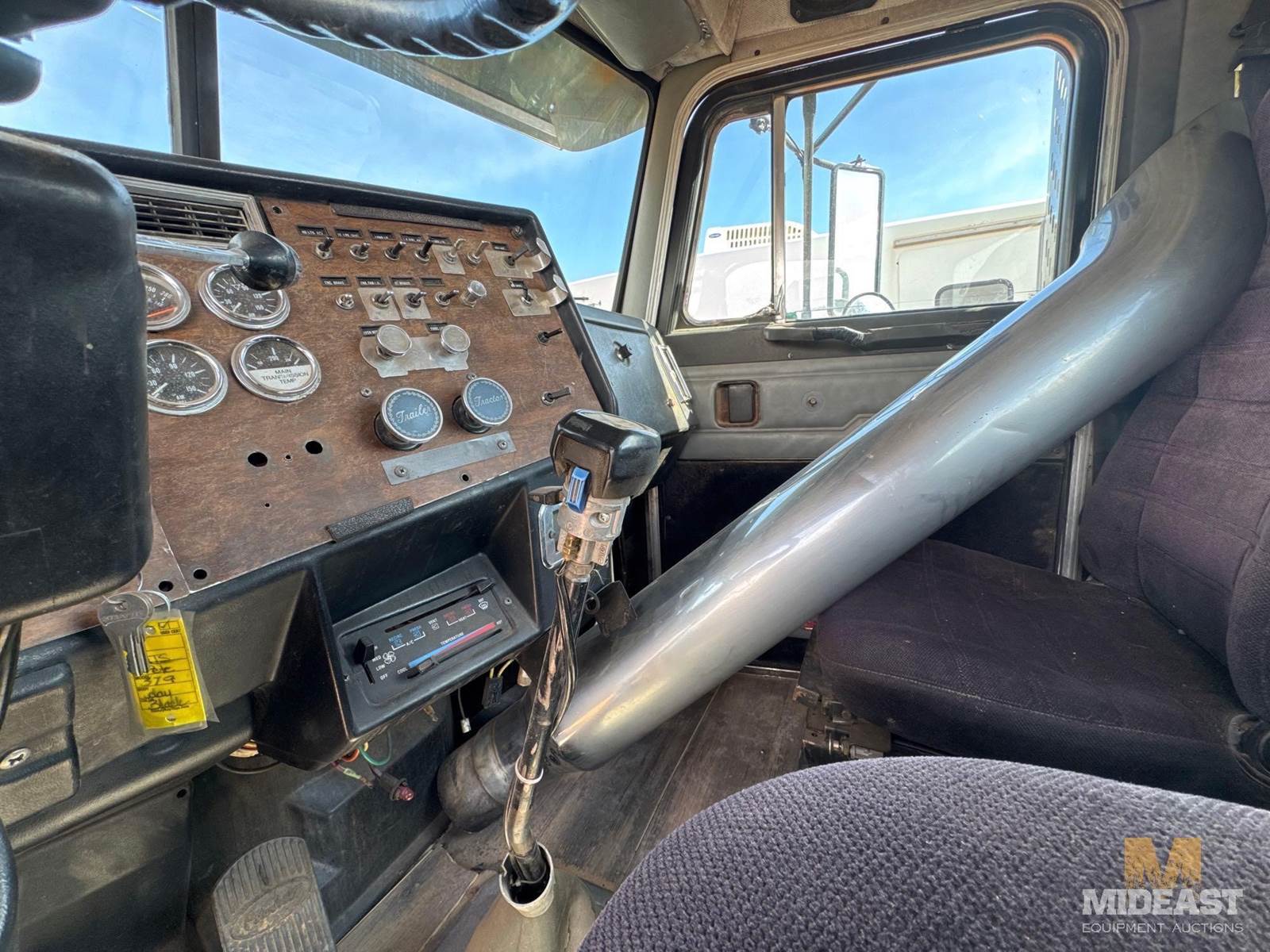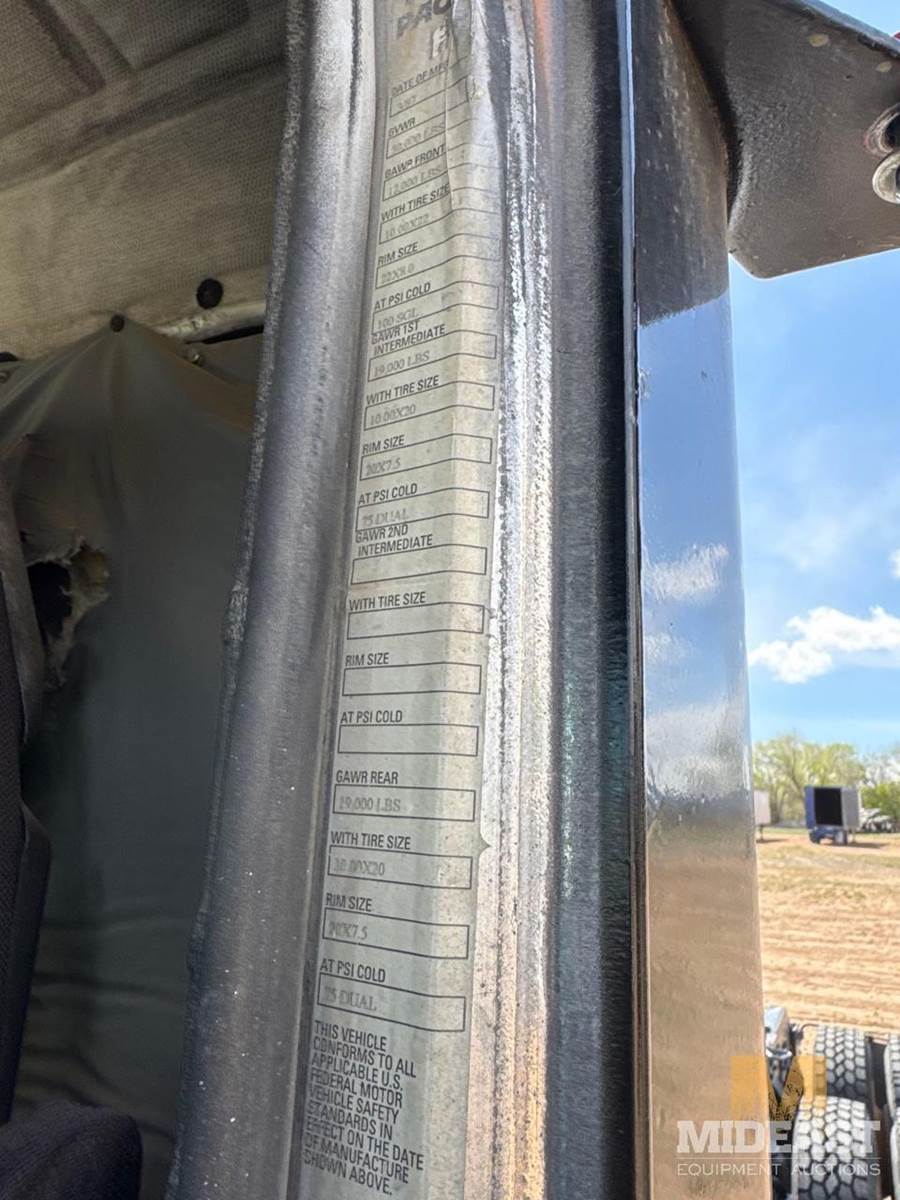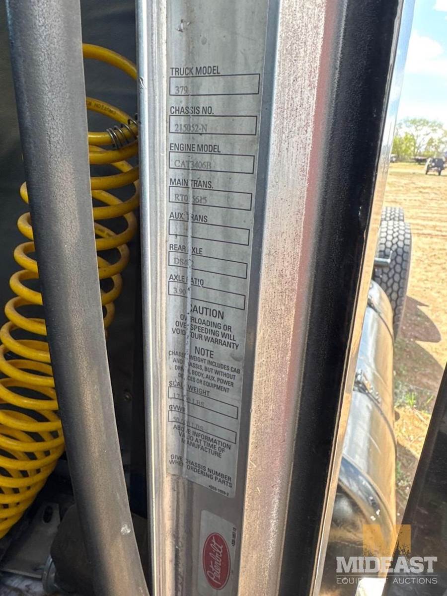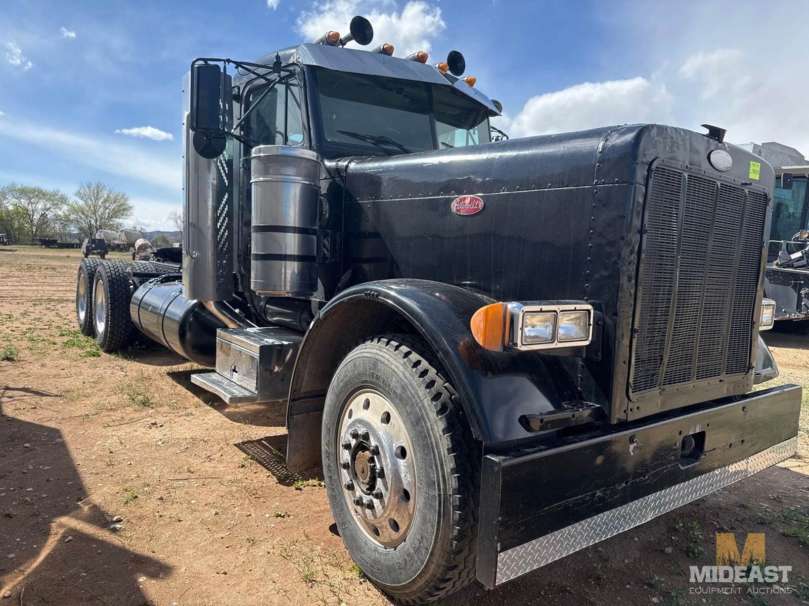 Peterbilt tandem axle day cab semi truck. Heavy-duty setup with dual rear axles and wet kit/PTO controls (Chelsea PTO shown), making it suitable for dump, lowboy, or oilfield applications. Classic long-hood Pete styling with dual vertical exhaust and external air cleaners.Truck shows solid bones with good tread on tires and intact fifth wheel setup. Interior is complete with gauges and controls present. Cosmetic wear consistent with use (chips, dust, surface rust in spots).Highlights:Peterbilt conventional day cabTandem axle (dual rears)Wet kit / PTO equippedDual exhaust stacksExternal air cleanersFifth wheel plateGood tire tread