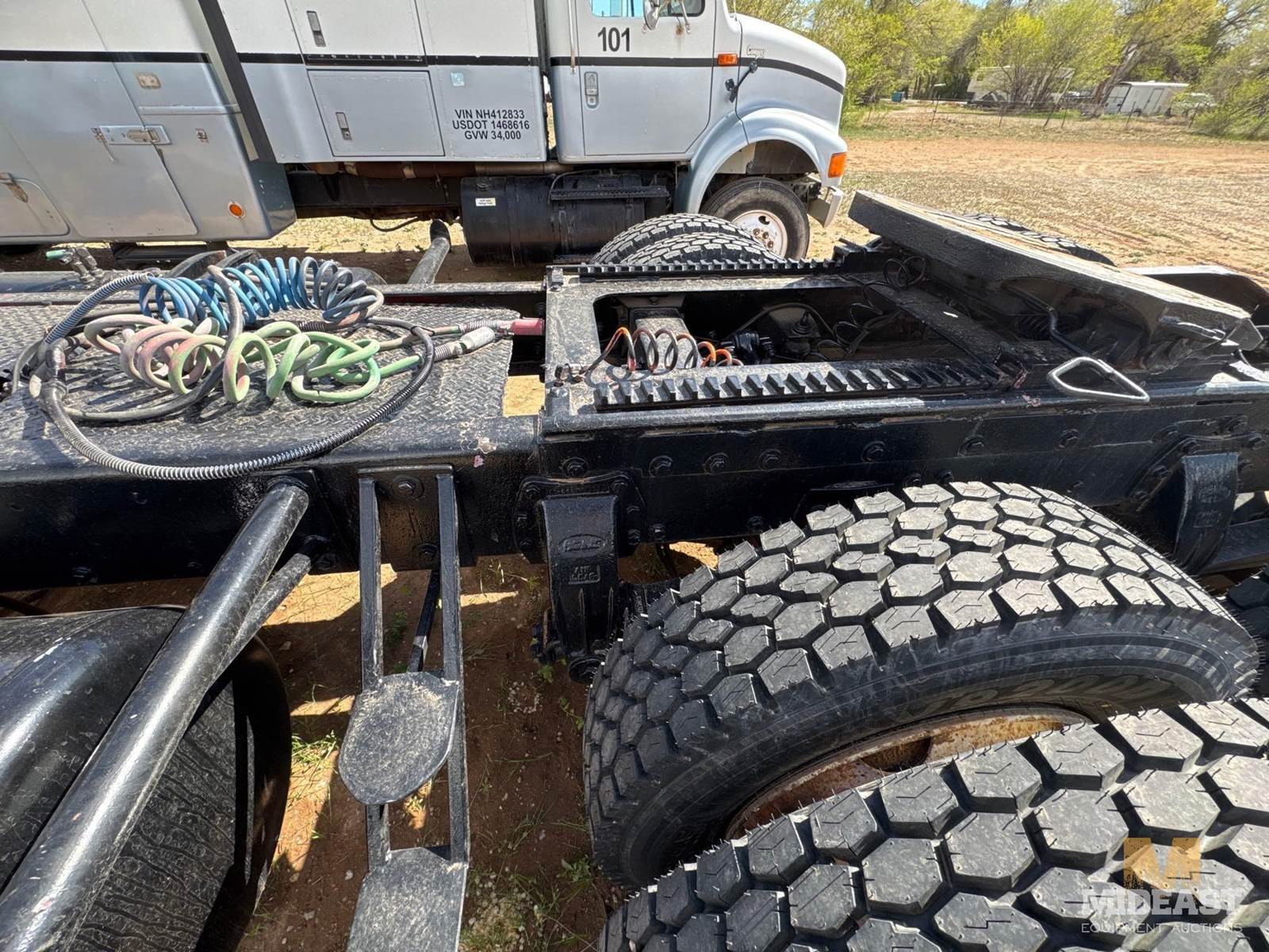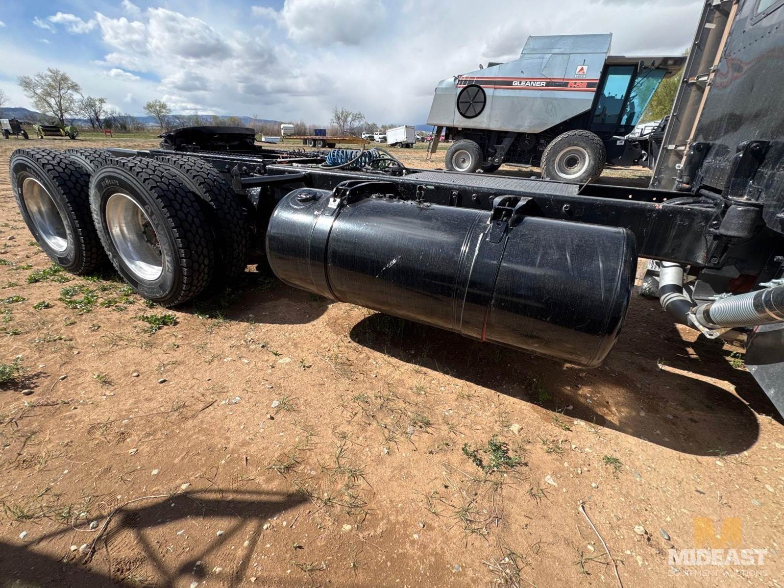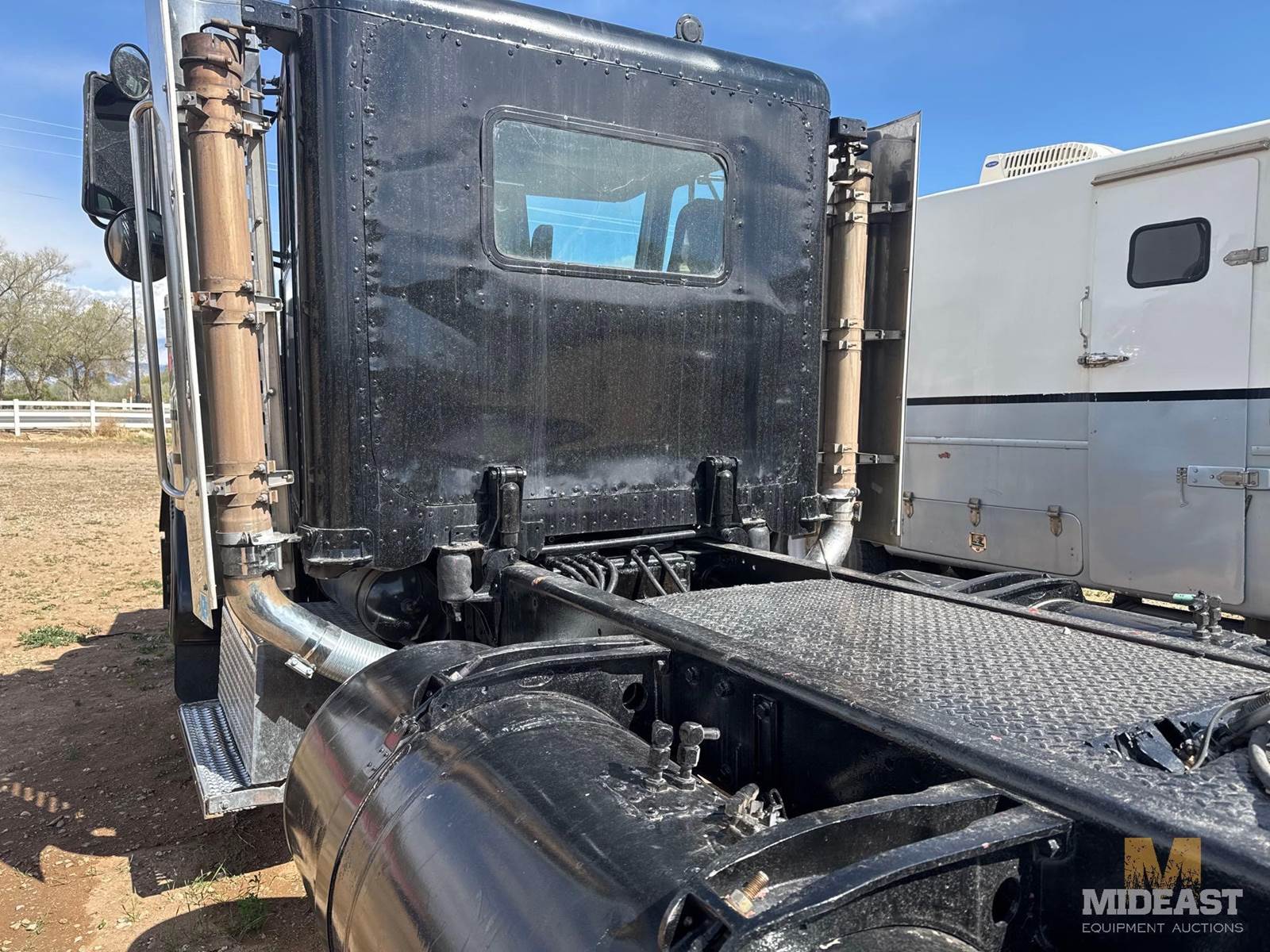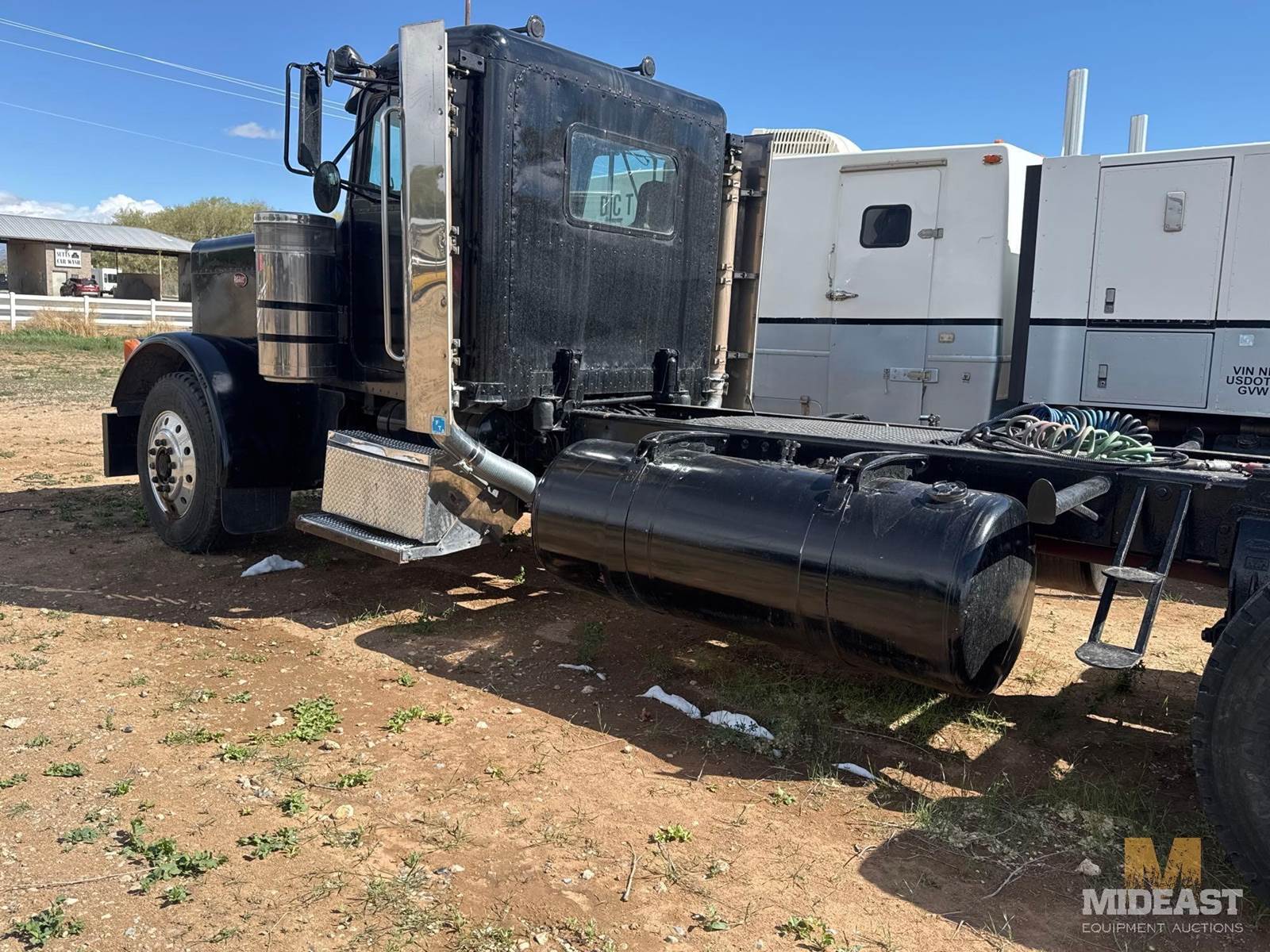 Peterbilt tandem axle day cab semi truck. Heavy-duty setup with dual rear axles and wet kit/PTO controls (Chelsea PTO shown), making it suitable for dump, lowboy, or oilfield applications. Classic long-hood Pete styling with dual vertical exhaust and external air cleaners.Truck shows solid bones with good tread on tires and intact fifth wheel setup. Interior is complete with gauges and controls present. Cosmetic wear consistent with use (chips, dust, surface rust in spots).Highlights:Peterbilt conventional day cabTandem axle (dual rears)Wet kit / PTO equippedDual exhaust stacksExternal air cleanersFifth wheel plateGood tire tread